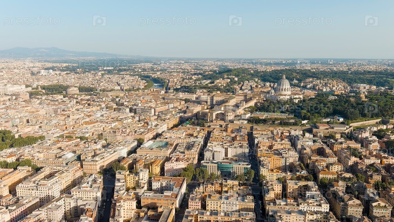 Рим, Италия. Вид на Ватикан. Купол базилики Сан-Пьетро, Полет над городом. Вечернее время, вид с воздуха