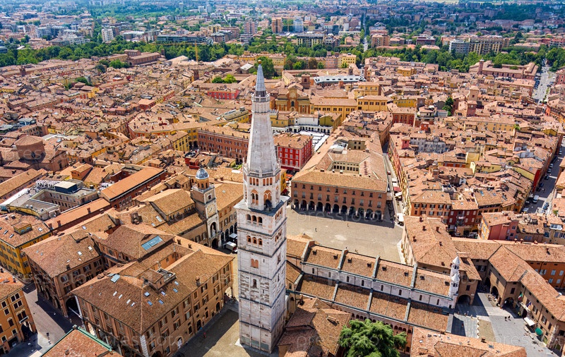 Модена, Италия. Историческая колокольня. Торре Чивица — Гирландина. Панорама города в летний день. Солнечная погода