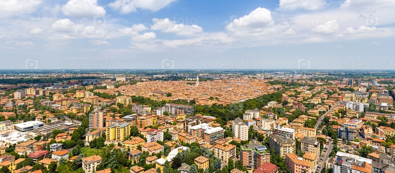 Модена, Италия. Исторический центр. Панорама города в летний день. Солнечная погода с облаками. Вид с воздуха