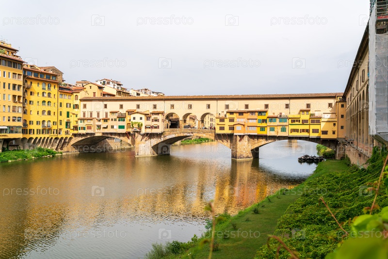 Флоренция, Италия. Понте Веккьо - средневековый арочный мост с сувенирными и ювелирными магазинами. Летний день