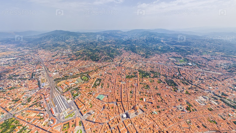 Флоренция, Италия. Центральный железнодорожный вокзал. Общий вид на город в солнечный день. Вид с воздуха