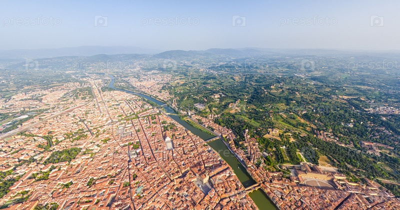 Флоренция, Италия. Общий вид на город в солнечный день. Река Арно. Вид с воздуха