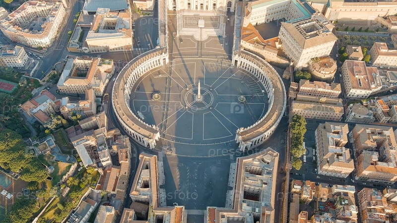 Рим, Италия. Вид на Ватикан. Базилика Сан Пьетро, площадь Сан Пьетро. Полет над городом. Утренние часы, вид с воздуха