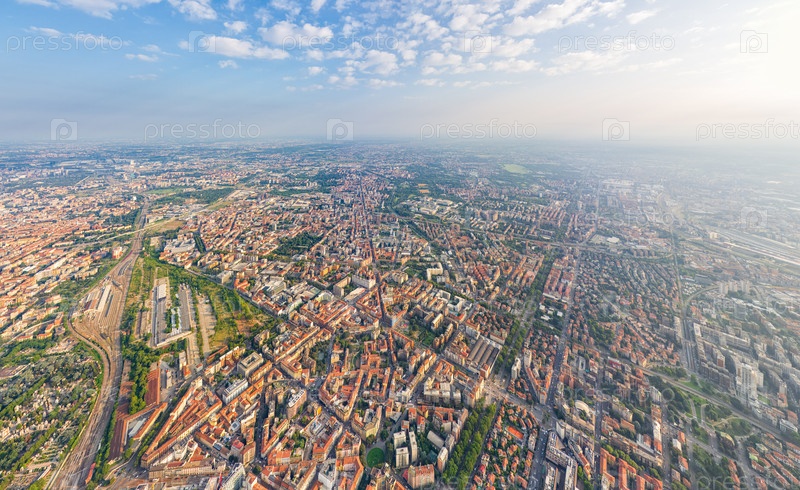 Милан, Италия. Панорама центральной части города. Летний день с облаками. Вид с воздуха