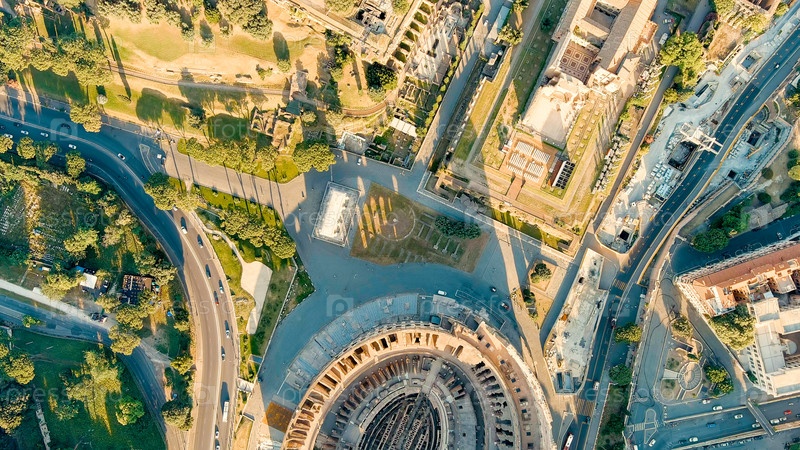 Рим, Италия. Руины Древнего Рима. Полет над городом. Панорама города утром. Лето, вид с воздуха