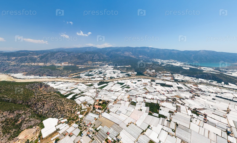 Демре, Турция. Эпический вид с воздуха на долину полностью преобразился и заполнился до краев однородным пространством белых тепличных покровов под огромным летним небом. Вид с воздуха