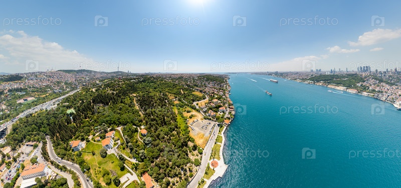 Стамбул, Турция. Парк береговой линии на азиатской стороне пролива Босфор с густой зеленью и деревьями. Воздушный панорамный вид на лесистый берег и воду в летний полдень. Вид с воздуха