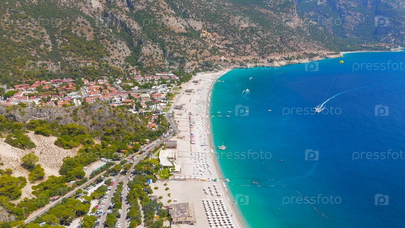 Олудениз, Турция. Вид воздушного дрона сверху на желтый парасейл над скоростным катером на бирюзовом море, пляже Олудениз и горной береговой линии на заднем плане, лето. Вид с воздуха