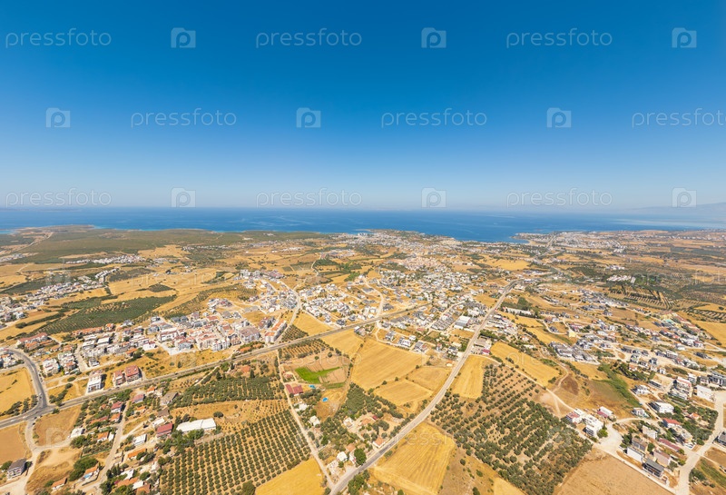 Дидим, Турция. Средиземноморский прибрежный ландшафт с сельскохозяйственными полями, жилыми районами и холмами. Вид с воздуха