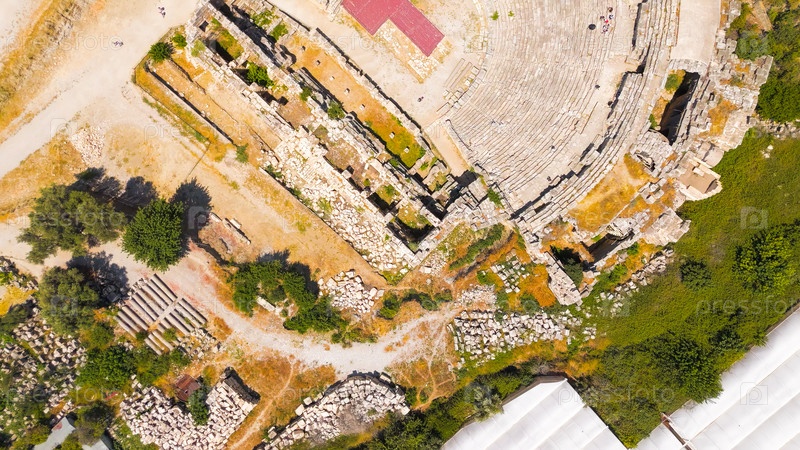 Демре, Турция. Сверху вниз симметричный вид с воздуха на древний амфитеатр Мира, показывающий идеальный дизайн круговой структуры. Вид с воздуха