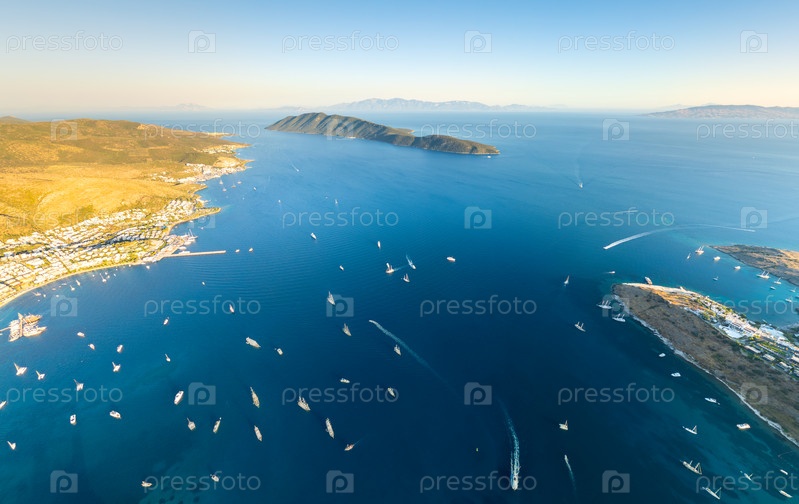Бодрум, Турция. Мирный вид на закат над заливом с многочисленными яхтами и лесистыми островами в заливе Гокова под вечерним небом. Вид с воздуха