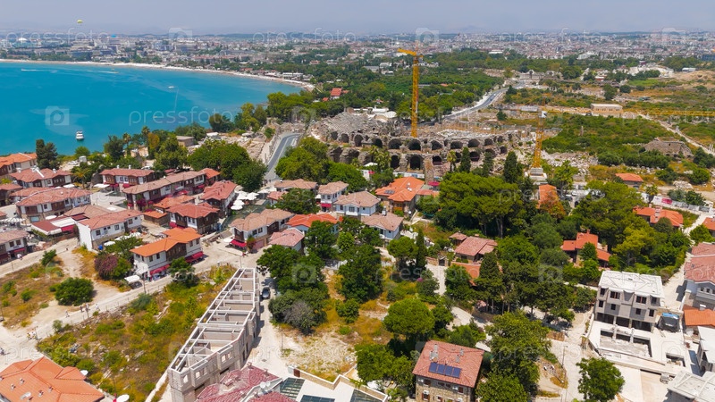 В сторону, Манавгат, Турция. Древнеримский амфитеатр со строительными кранами во время реставрационных работ, вид с воздуха в солнечный летний день. Вид с воздуха