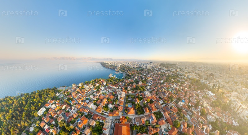 Анталия, Турция. Широкая панорамная фотография, сделанная с высоты, показывает исторический Старый город Калеичи, береговую линию со Средиземным морем и современный город под утренним солнцем. Вид с воздуха