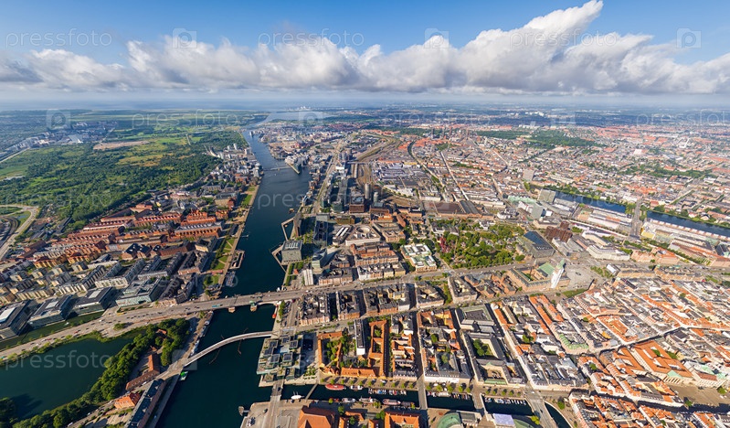 Копенгаген, Дания. Панорама города летом. Солнечная погода с облаками. Вид с воздуха