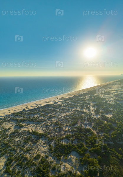 Гелемис, Турция. Закат над Средиземным морем на пляже Патара с маяком, песчаными дюнами и отражением солнца на воде. Вид с воздуха