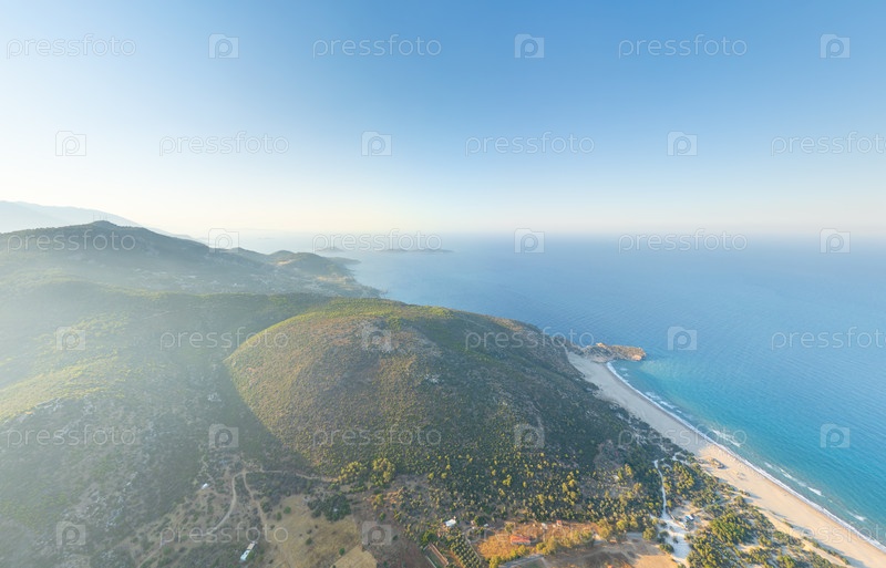 Гелемис, Турция. Панорамный летний утренний вид на зеленые горы, окружающие Патару, с древним городом и бирюзовым средиземноморским побережьем. Вид с воздуха