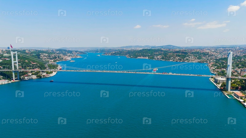 Стамбул, Турция. Вид с воздушного дрона на мост Мучеников 15 июля жизненно важное транспортное сообщение через пролив Босфор, соединяющий европейскую и азиатскую стороны Стамбула. Вид с воздуха