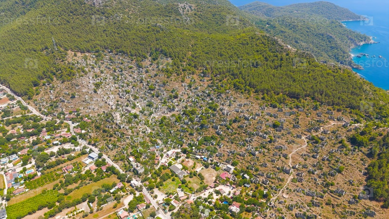 Каякой, Турция. Панорамный вид на заброшенные руины города-призрака на горных склонах со средиземноморским побережьем и морем на заднем плане. Вид с воздуха