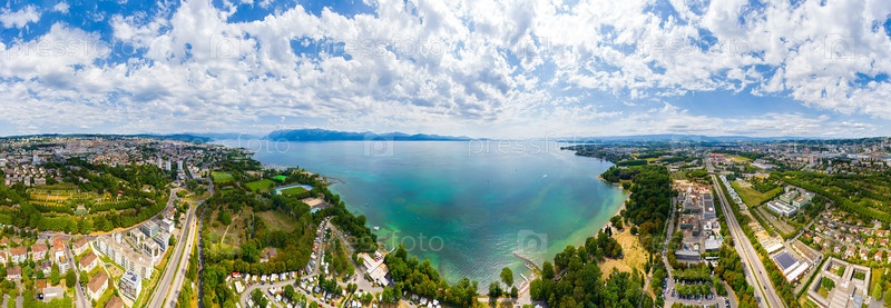 Лозанна, Швейцария. Набережная озера и панорама города летом. Вид с воздуха