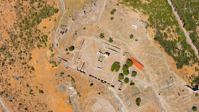 Бергама, Турция. Вершина акрополя с храмом Траянеум и Алтарем Зевса в ветреный жаркий полдень. Вид с воздуха