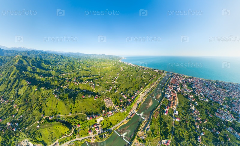 Ардешен, Турция. Город на черноморском побережье Турции. Долина реки Фиртина. Устье реки. Летнее солнечное утро. Панорама. Вид с воздуха