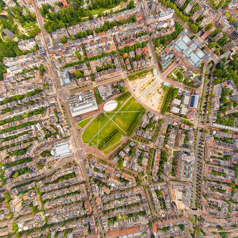 Амстердам, Нидерланды. Museumplein - это площадь, в которой находятся три известных музея. Парк, где проводятся фестивали. Панорама города летним утром в пасмурную погоду. Голова выше головы. Вид с воздуха