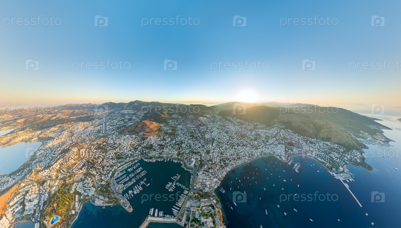 Бодрум, Турция. Премиальная панорама недвижимости с белыми виллами на холмах, роскошной пристанью для яхт и эксклюзивными островами в желанном турецком месте. Вид с воздуха