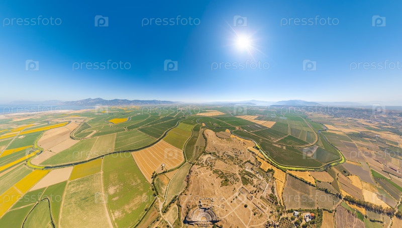 Балат, Дидим, Турция. Широкая воздушная панорама полного археологического комплекса Милета с театром, полями и видом на море. Вид с воздуха
