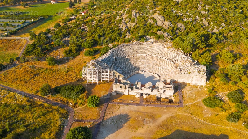 Гелемис, Турция. Воздушная панорама древнего театра Патара, построенного на склоне холма Курсунлу, древнего археологического памятника Ликийского города летом утром. Вид с воздуха