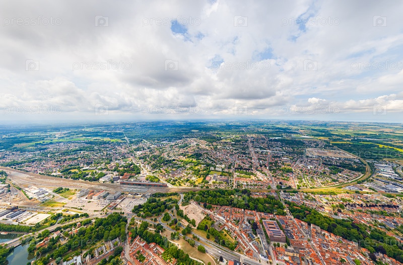 Брюгге, Бельгия. Центр города и окрестности. Жилые и промышленные зоны. Панорама города. Летний день, облачная погода. Вид с воздуха