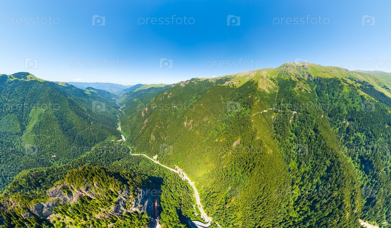 Альтиндере, провинция Трабзон, Турция. Парк Алтиндер Вэлли. Хвойный лес на склонах. Дорога через долину. Вид с воздуха