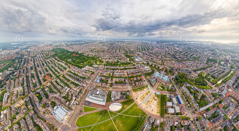 Амстердам, Нидерланды. Museumplein - это парк, площадь, содержащая три известных музея и парк, где проводятся фестивали. Панорама города летним утром в пасмурную погоду. Вид с воздуха
