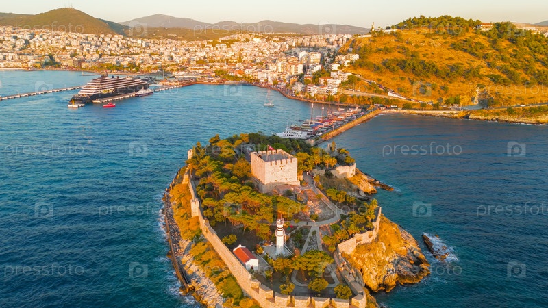 Кусадаси, Турция. Вид с воздуха на живописный остров голубей, соединенный дамбой с береговой линией Кусадаси. Летний вечерний снимок крепости и парка. Вид с воздуха