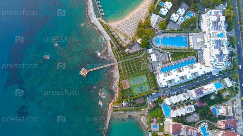 Авсаллар, Алания, Турция. Панорамный вид на инфраструктуру прибрежного туризма с отелями, бассейнами, пляжами и дорогами, заканчивающийся золотым закатом над средиземноморской береговой линией. Вид с воздуха
