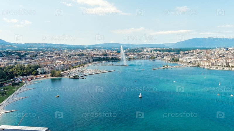 Женева, Швейцария. Фонтан Дже-До. Большая фонтанная струя до 140 метров. Главная достопримечательность Женевского озера. Летний день, Aerial View