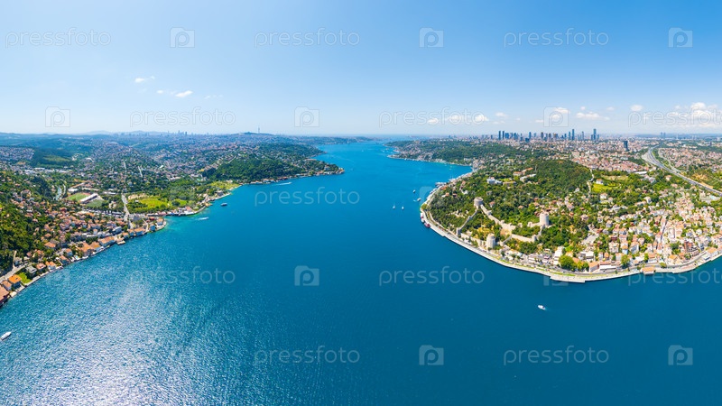 Стамбул, Турция. Панорамный вид дрона подчеркивает Босфор как границу между Европой и Азией. Вид с воздуха
