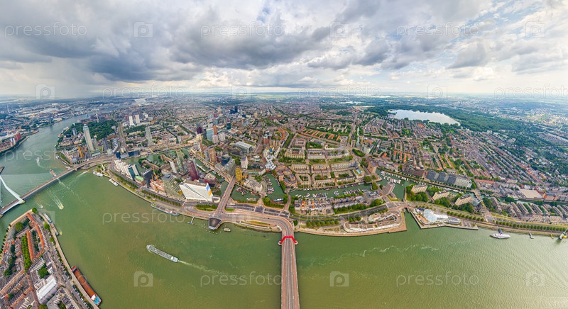 Роттердам, Нидерланды. Панорама летнего города в дождливую погоду. Облака. Вид с воздуха