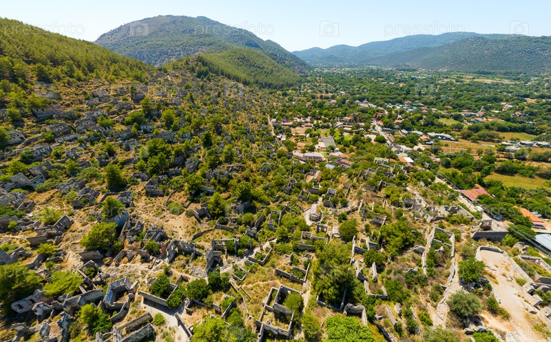 Каякой, Турция. Широкая панорама заброшенного поселения Левисси, заросшего местной растительностью на наклонной местности, с сетью дорожек для посетителей, соединяющих древние каменные руины. Вид с воздуха