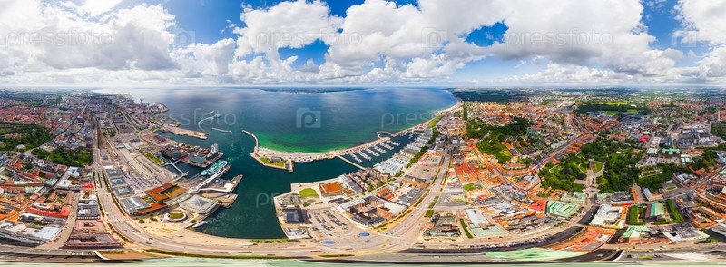 Хельсингборг, Швеция. Панорама города летом с портовой инфраструктурой. Оресундский пролив. В дневное время. Панорама 360. Вид с воздуха