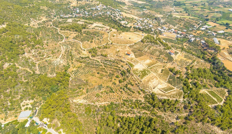 Какаллар, Алания, Турция. Широкая воздушная панорама долинного поселения с аккуратными сельскохозяйственными участками и древесными плантациями, расположенными на лесистых горных склонах. Вид с воздуха