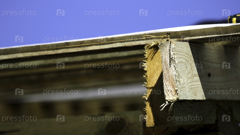 Закройте кровельную деревянную конструкцию гвоздем и плотной веревкой вокруг нее на голубом фоне неба. Запасные кадры. Грубые деревянные доски и крыша, покрывающая белую ткань, покачивающуюся на ветру