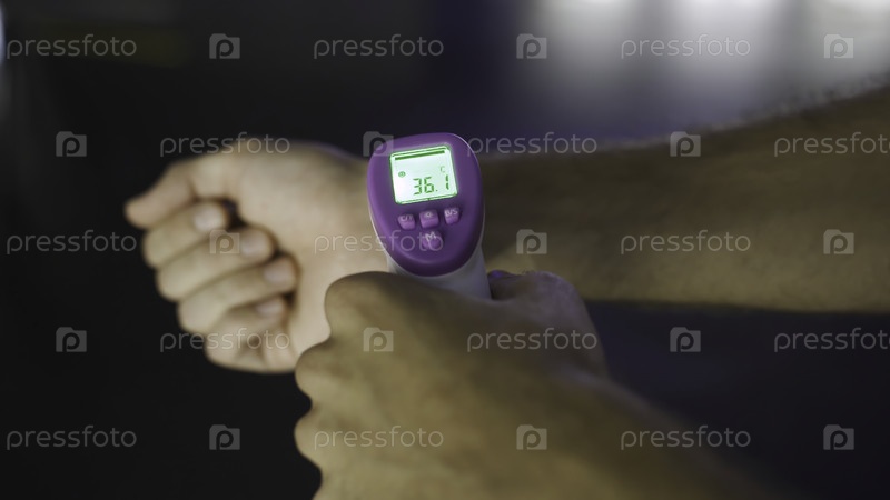 Человек, измеряющий температуру термометром другого человека. Закройте мужскую руку, используя неконтактный инфракрасный термометр для профилактики коронавируса