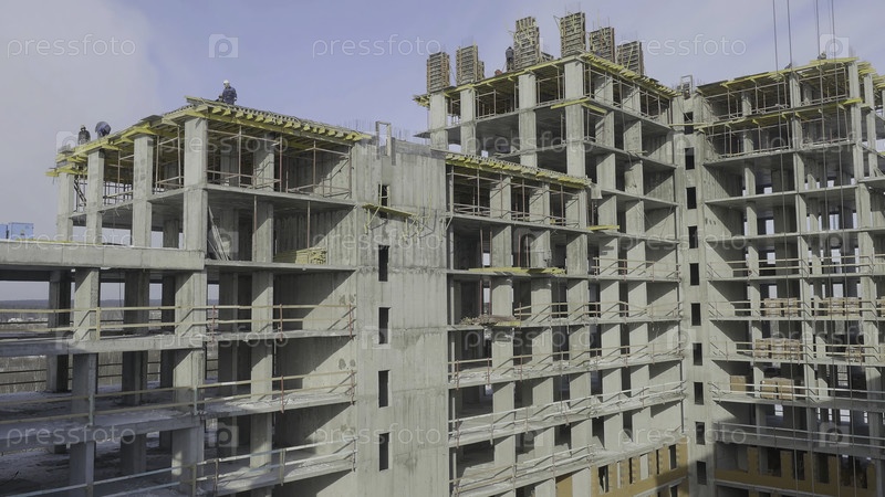 Строительная площадка работает против голубого неба. Рабочие на стройплощадке многоквартирного дома