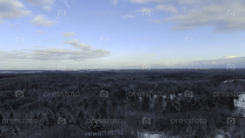 Вид с воздуха на удивительные лесные пейзажи и замерзшие деревья, покрытые снегом на фоне голубого облачного неба в зимний день. Движение. Живописный зимний пейзаж