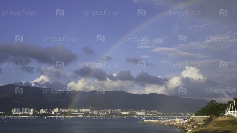 Захватывающий вид радуги касается моря во время дождя в небольшом городке на берегу Черного моря. Летний морской пейзаж на голубом облачном фоне неба