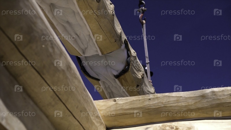 Закрытие деревянного дома и подъемный кран с древесиной. Клип. Деревянный дом, строящийся на фоне крана с бревном. Деревянная конструкция дома на фоне голубого неба