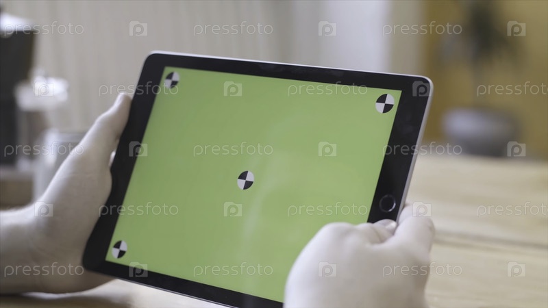 Технология, макет и концепция интернета, хрома-ключ для размещения собственного контента. Запасные кадры. Молодая женщина смотрит на компьютерный планшет с зеленым экраном