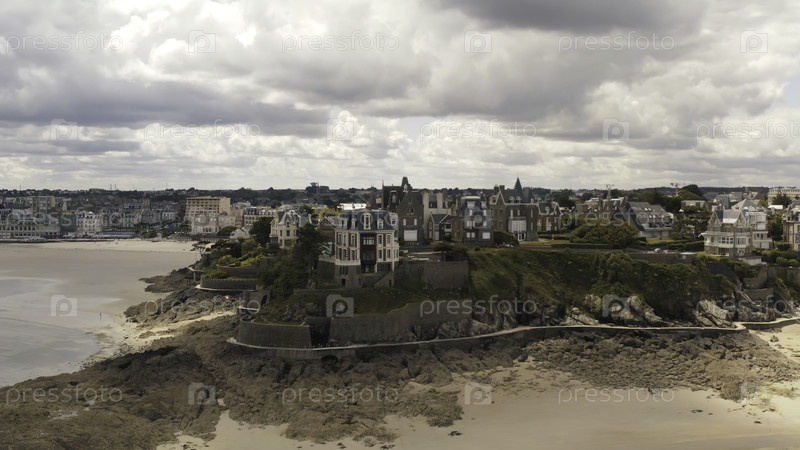 Прекрасный вид с воздуха на серый старый европейский город около песчаного берега реки летом на фоне серого облачного неба. Действуй. Великолепная европейская архитектура
