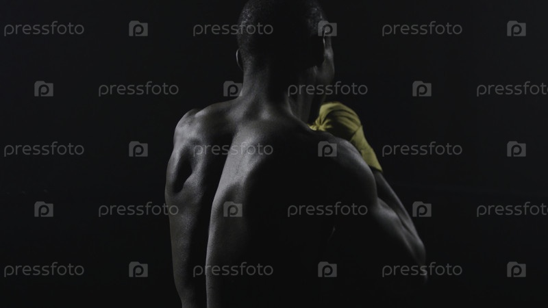 Задний вид мускулистого мужчины боксирует на черном фоне. Афроамериканский молодой боксер, практикующий теневой бокс. Боксер в желтых боксерских перчатках