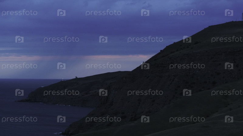 Вид сверху на край берега с маяком на берегу. Стреляли. Раннее утро на берегу моря у высоких скал